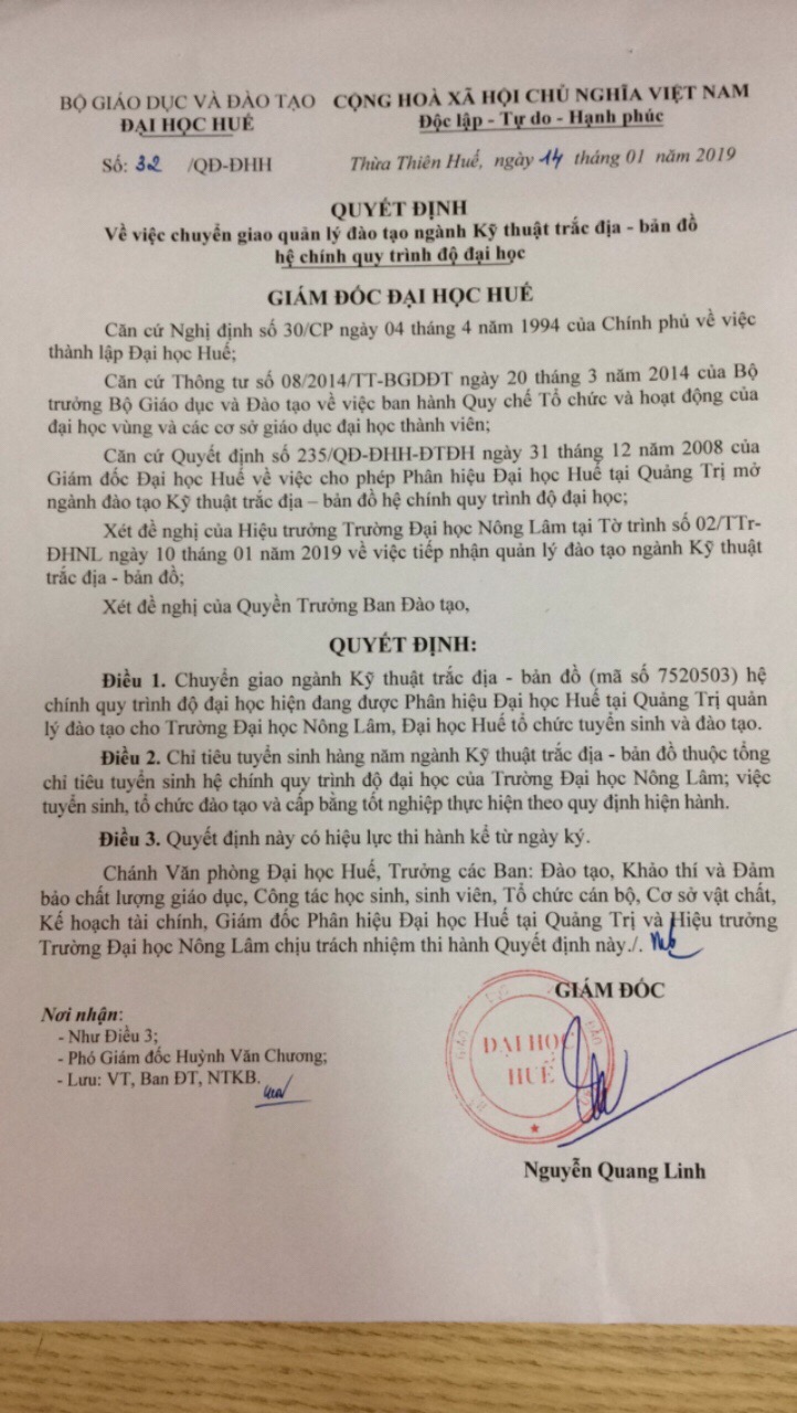Về việc chuyển giao quản lý đào tạo ngành Kỹ thuật trắc địa – bản đồ hệ chính quy trình độ đại học