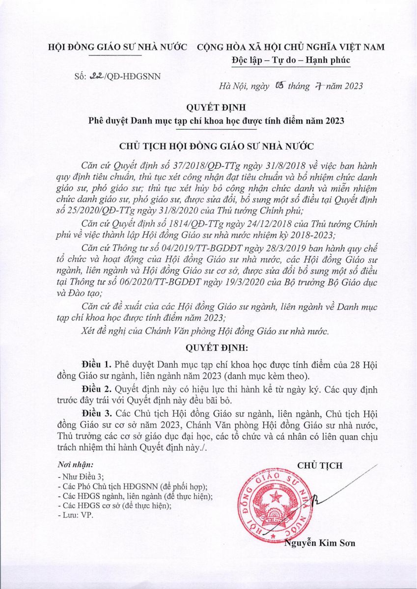 Quyết định số 22/QĐ-HĐGSNN về phê duyệt Danh mục tạp chí khoa học được tính điểm năm 2023