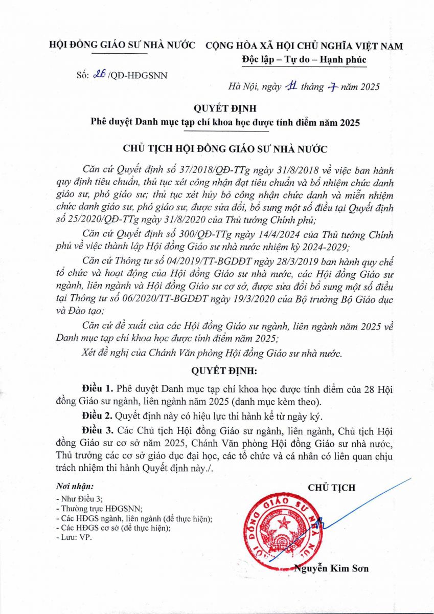 | 5 | 26-QD-HDGSNN2025 | Quyết định Phê duyệt Danh mục tạp chí khoa học được tính điểm năm 2025 |